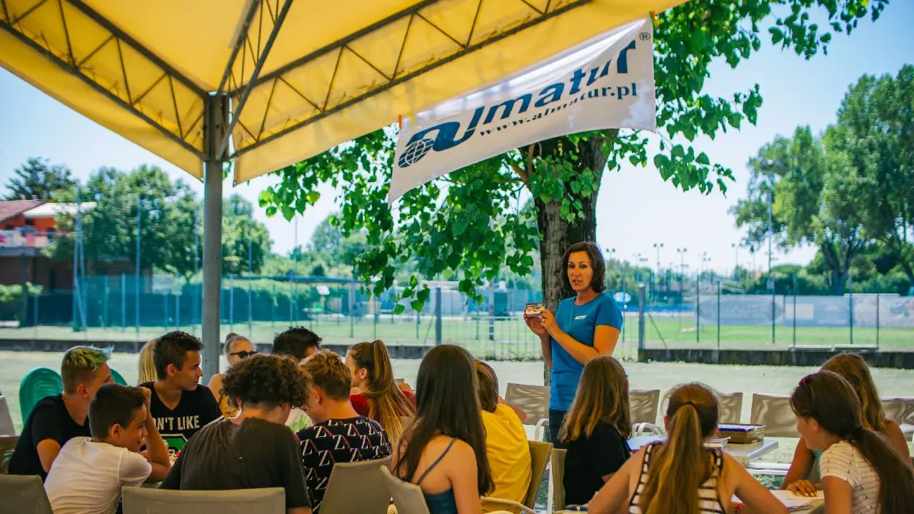 Włochy - Cesenatico - kolonia języka włoskiego(wiek 10-13 lat)Almaturowskie Centrum Aktywnego Wypoczynku Podczas zagranicznych wakacji szybko przekonasz się, jak przydatna jest znajomość języków! Możesz przełamać bariery, ponieważ wyjazd za granicę to najlepsza motywacja do doskonalenia języka obcego. W ramach pobytu zaplanowaliśmy 10 godzin lekcyjnych zajęć językowych w formie warsztatów, konwersacji i scenek sytuacyjnych. Otrzymasz wszystkie potrzebne materiały. Dodatkowo, zaprosimy Cię do udziału w grach i spotkaniach integracyjnych – idealna okazja, by zdobyć nowe znajomości! Ponadto program pełen atrakcji przygotowany przez animatorów Almaturowskiego Centrum Aktywnego Wypoczynku zapewnia, że każdy znajdzie coś dla siebie! W planie mamy na przykład kąpiele w morzu, plażowanie, zajęcia z aerobiku, konkursy, gry, zabawy, sportowe turnieje z nagrodami oraz imprezy taneczne. Na prywatnej plaży ośrodka czekają leżaki i parasole dla każdego uczestnika, a opiekę zapewnia ratownik. Wieczory urozmaicą kalambury i karaoke, więc nie będzie czasu na nudę! Będzie też okazja do degustacji oryginalnych włoskich potraw w trakcie Pizza Party. W ramach programu turystycznego zapraszamy na zwiedzanie urokliwego Cesenatico, gdzie zobaczymy m. in.: słynny port rybacki zaprojektowany przez Leonarda da Vinci oraz skansen kolorowych łodzi żaglowych. W drodze powrotnej czeka Was niezapomniana wizyta w Mirabilandii — największym parku rozrywki we Włoszech! Bilet pozwala korzystać do woli z ponad 40 atrakcji, w tym z rollercoasterów, karuzeli, pokazów artystów i występów kaskaderów (więcej na www.mirabilandia.it). Dla chętnych przygotowaliśmy dodatkowe wycieczki do takich miejsc jak Rzym, Wenecja czy San Marino. Czeka Was też zabawa i relaks w pobliskim parku wodnym Atlantica! Przykładowy program obozu 1 dzień: Wyjazd z Polski wg rozkładu jazdy. Przejazd przez Czechy, Austrię i Włochy. 2dzień: Przyjazd do ośrodka w godzinach dopołudniowych. Po obiedzie zakwaterowanie w pokojach. Spotkanie organizacyjne. Przekazanie praktycznych informacji dotyczących wypoczynku, regulaminów, programu i oferty wycieczek. Wieczorny program integracyjny i dyskoteka. 3 dzień: W ramach rekreacyjnego programu dopołudniowego będzie czas na plażowanie i kąpiele w morzu oraz zajęcia językowe. Po obiedzie, odpoczynek, czyli czas na tradycyjną włoską sjestę. Popołudniowe zajęcia obejmują np.: gry i zabawy sportowe, konkursy, plażowanie. Dla chętnych fakultatywne wyjście do Parku Wodnego Atlantica. 4 dzień: Zajęcia na plaży przygotowane przez wychowawców i zajęcia językowe. Po południu spacer plażą do Zadiny. Wieczorny program integracyjny: gra terenowa. Dla chętnych całodniowa wycieczka fakultatywna do Rzymu. 5 dzień: Zwiedzanie zabytków Cesenatico m.in.: starego portu rybackiego zaprojektowanego przez Leonarda da Vinci ze skansenem kolorowych łodzi żaglowych. Po południu aktywny wypoczynek na plaży, zajęcia językowe. Dla chętnych półdniowa wycieczka fakultatywna do San Marino. 6 dzień: Kąpiele w morzu i zajęcia sportowe na plaży np. siatkówka, baloniada, Zumba. Po południu relaks na plaży, aktywności sportowe. Rzeźba z piasku. Wieczorne animacje (np. karaoke połączone z dyskoteką, projekcje filmów pod gwiazdami). Dla chętnych całodniowa wycieczka fakultatywna do Wenecji. 7 dzień: Zajęcia sportowe na plaży, kąpiel w morzu oraz zajęcia dodatkowe. Po południu aktywny wypoczynek na plaży i zajęcia specjalistyczne. Wieczorny program animacyjny. 8 dzień: Czas na plażowanie i kąpiele w morzu. Wyjście na tradycyjny targ Mercato. Impreza pożegnalna, w trakcie której nastąpi rozdanie dyplomów i nagród za poszczególne konkursy. Dyskoteka. 9 dzień: Rano wykwaterowanie i wyjazd w drogę powrotną. Pobyt w ekscytującym parku rozrywki Mirabilandia, gdzie każdy znajdzie coś ciekawego dla siebie. Wieczorem wyjazd do Polski. Nocny przejazd przez Włochy. 10 dzień: Przejazd przez Austrię i Czechy. Przyjazd do Polski w godzinach dopołudniowych. Program fakultatywny Propozycje wycieczek dodatkowych realizowanych przez włoskiego kontrahenta (przy odpowiedniej liczbie chętnych): Kompleks Międzynarodowego Ośrodka Wypoczynkowego w Cesenatico położony jest bezpośrednio przy piaszczystej plaży, składa się z budynków: La Perla oraz Blu Mare. Pokoje 4-, 5-, 6-osobowe z łazienkami. W kompleksie ośrodka: duża, prywatna, piaszczysta plaża z parasolami i leżakami dla każdego uczestnika, sala dyskotekowa, boisko do koszykówki, boiska do siatkówki plażowej i kometki. Bezpłatne WiFi przy recepcji obiektu. Ponadto: kawiarenka, stoły do tenisa, huśtawki. Zakwaterowanie: 7 noclegów. Uczestnicy muszą zabrać: ważny paszport lub dowód osobisty (uczestnicy bez ważnego dokumentu nie mogą być zabrani na wyjazd), kartę kwalifikacyjną, krem z filtrem UV, okulary przeciwsłoneczne, nakrycie głowy, strój sportowy i kąpielowy, ręczniki, środki higieny, butelkę na wodę lub bidon oraz mały plecak na wycieczki. Serwis plażowy zapewnia dostęp do plaży z leżakami, parasolami i natryskami. Rekomendujemy wyrobienie bezpłatnej Europejskiej Karty Ubezpieczenia Zdrowotnego (EKUZ). Świadczenia, transport oraz zajęcia specjalistyczne, mogą być realizowane wspólnie dla różnych grup wiekowych. Program wycieczek fakultatywnych jest realizowany dla osób chętnych. Udział w wycieczkach oznacza dobrowolną rezygnację ze świadczeń i programu realizowanego w tym czasie na ośrodku (bez prawa do rekompensaty za przepadające świadczenia i zajęcia np. językowe). Przejazd autokarem: granica Polski – Cesenatico zajmuje ok. 16 godzin (trasa biegnie przez Czechy, Austrię i Włochy; ok. 1,100 km). Planowany przyjazd do ośrodka drugiego dnia imprezy między 9:00 a 11:00, zakwaterowanie ok. 14:00. W drodze powrotnej, po wizycie w Mirabilandii, uczestnicy otrzymują posiłek, jednak ze względu na c